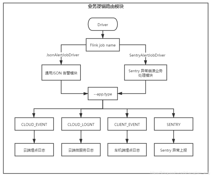 说明:业务上,需要告警的数据源目前有4中数据来源,分别是远端日志、云端微服务日志、车机端埋点、Sentry异常奔溃,其中Sentry 中的数据需要通过告警规则的筛选后发送到kafka中用于实时监控。设计上首先通过Driver中的class 路由到通用JSON告警模块或者Sentry异常奔溃业务处理模块,其次通过app.type 选择kafka中的数据源。