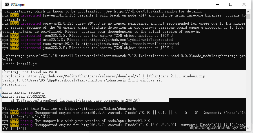 8.cmd到elasticsearch-head目录输入命令npm install,若安装报各种关于package.json的解析错误,使用'npm cache clean --force'命令清除缓存再安装。如果报错信息如下: