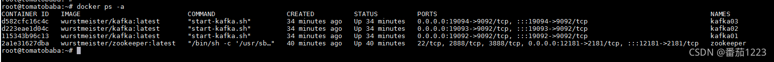 # 启动kafka容器,注意需要启动三台,注意端口的映射,都是映射到9092
