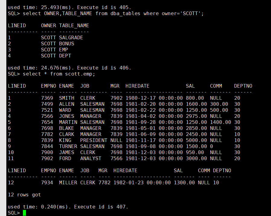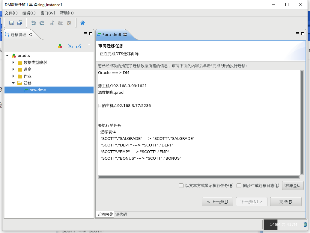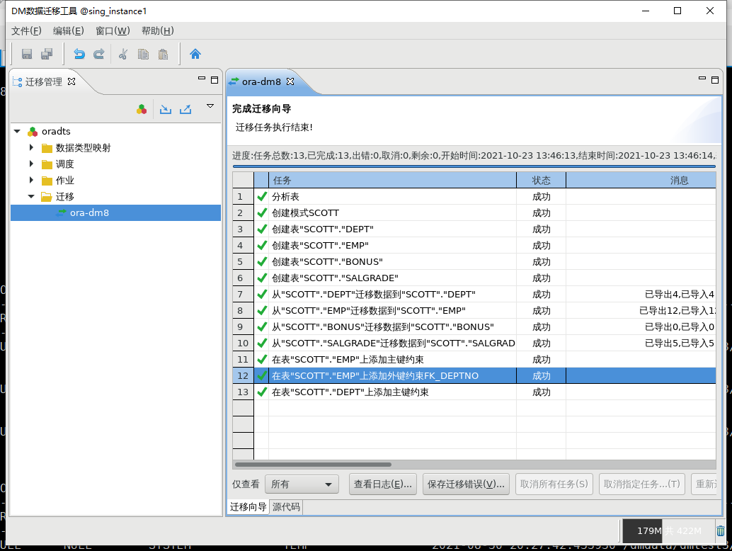 迁移完成,可以在达梦数据库上查询到信息 总结: 达梦DST是一款非常简单好上手的迁移工具,具备非常强的兼容性,在存储层面、语法层面、接口层面和它们保持高度兼容。在完成Oracle到DST迁移时需要注意Oracle的驱动包问题,驱动包问题会导致无法正确识别到Oracle数据库。