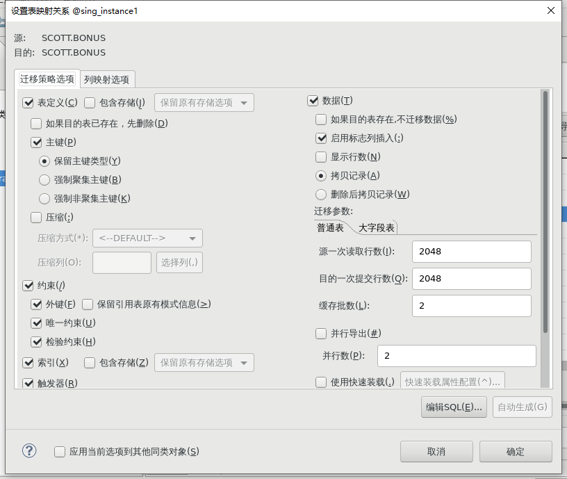 【约束】:可以选择在迁移过程中包括外键、唯一约束等各种约束; 【索引】:在迁移过程中包括索引的建立;