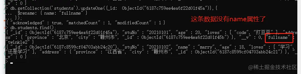 db.getCollection('students').updateOne({_id: ObjectId("6187c759ee4ea6f22d01f45a")},{$set:{name:"twinkle", "address.province": "北京" }})