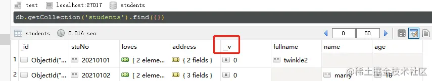 mongoose 在添加数据的时候,会默认给你加上一个属性__v,这个属性的全称是__version,顾名思义是版本的意思,作用是给每一个文档加上版本控制,防止并发来修改数据库的数据。