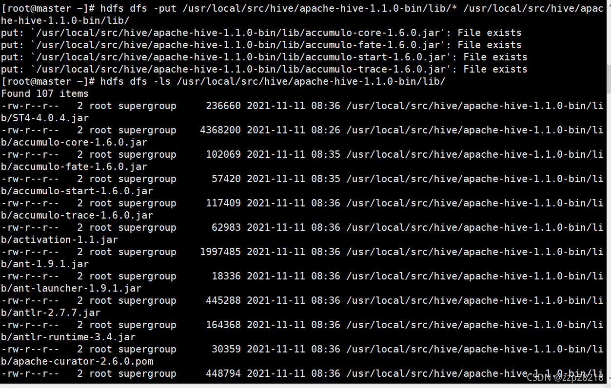 于是我尝试着把本地文件/usr/local/src/hive/apache-hive-1.1.0-bin/lib/accumulo-start-1.6.0.jar上传到hdfs中,但是它有报错,出现错误二的现象,于是我发现不对,找到/usr/local/src/hive/apache-hive-1.1.0-bin/lib/目录下去看: