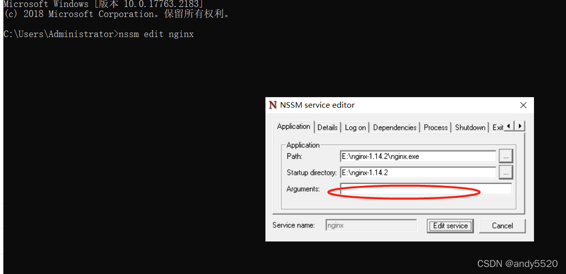 nssm install nginx,nginx 即注册服务的名称,此处为自定义 即nssm install {服务名} - 配置如下参数