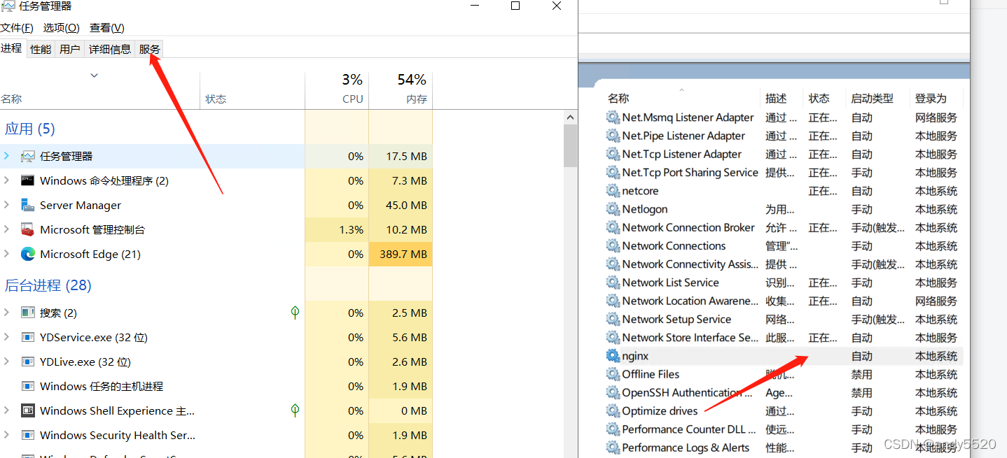 7. 在窗口输入启动命令 nssm start nginx 就可以启动服务了 或者手动在任务管理器-》服务点击手动启动