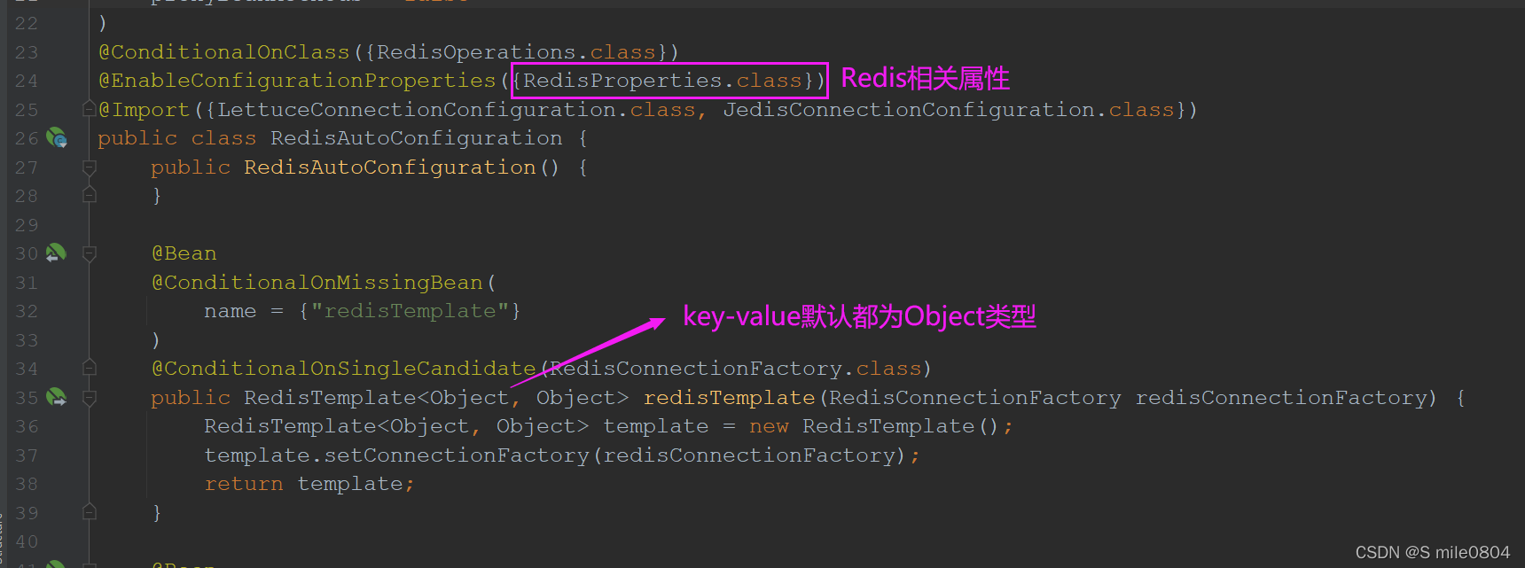 ? ? ? ? 实际上,Spring Boot已经在RedisAutoConfiguration.class类中为我们自动配置了相关属性,Key-Value自动配置为<Object , Object>的数据类型,但一般情况下我们习惯key为String类型,所以我们需要编写一个配置类,重新配置key-value的数据类型、以及key-value的序列化方式,并注入Spring容器中去。