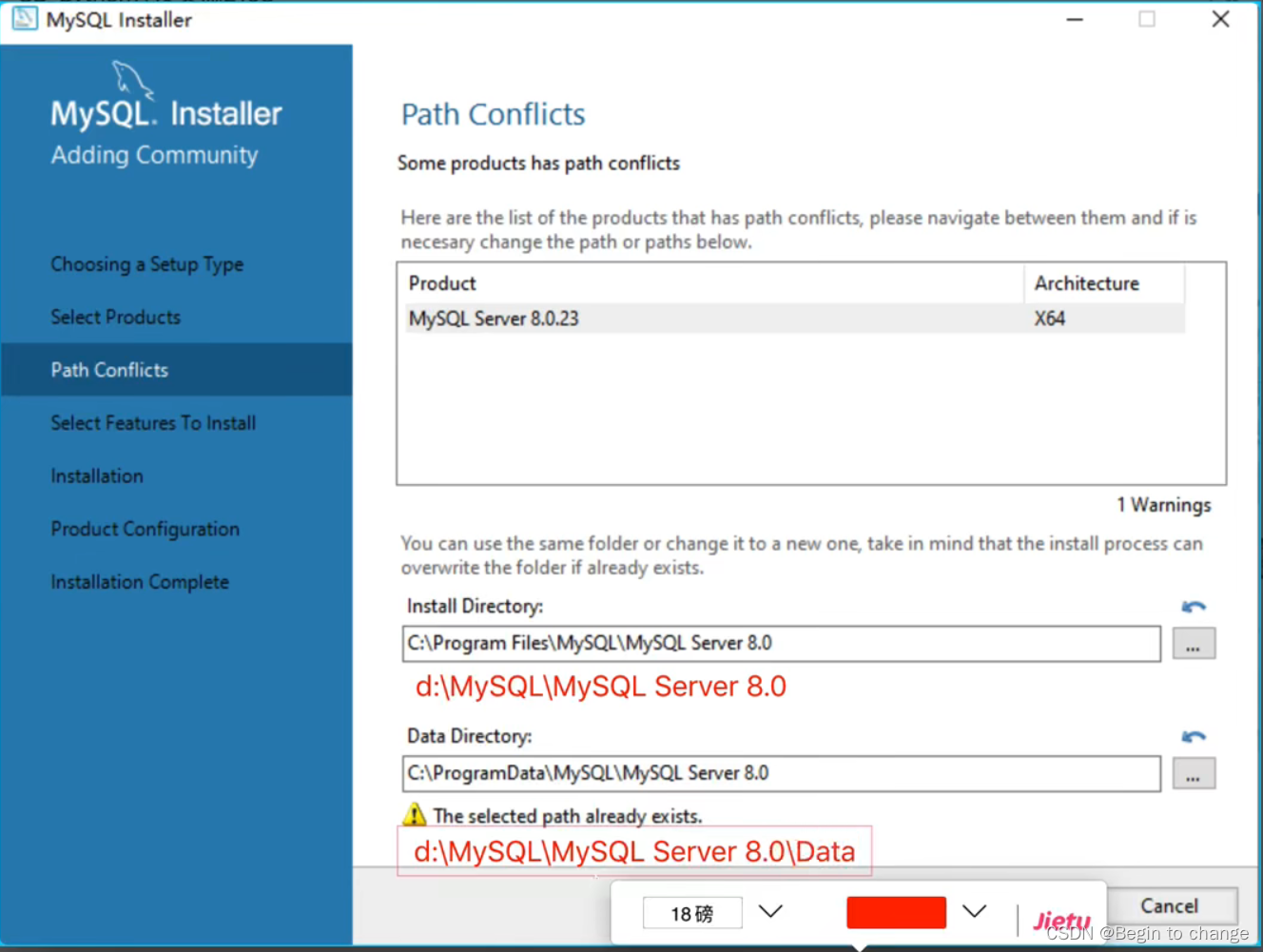 安装路径冲突,改安装路径即可(建议如下路径,不需要提前建路径,如果不存在会自动创建的)