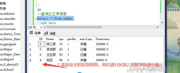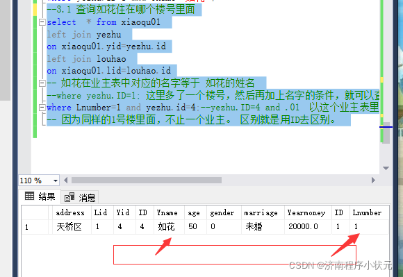 --where yezhu.ID=1; 这里多了一个楼号,然后再加上名字的条件,就可以查询到如花的楼号信息了.