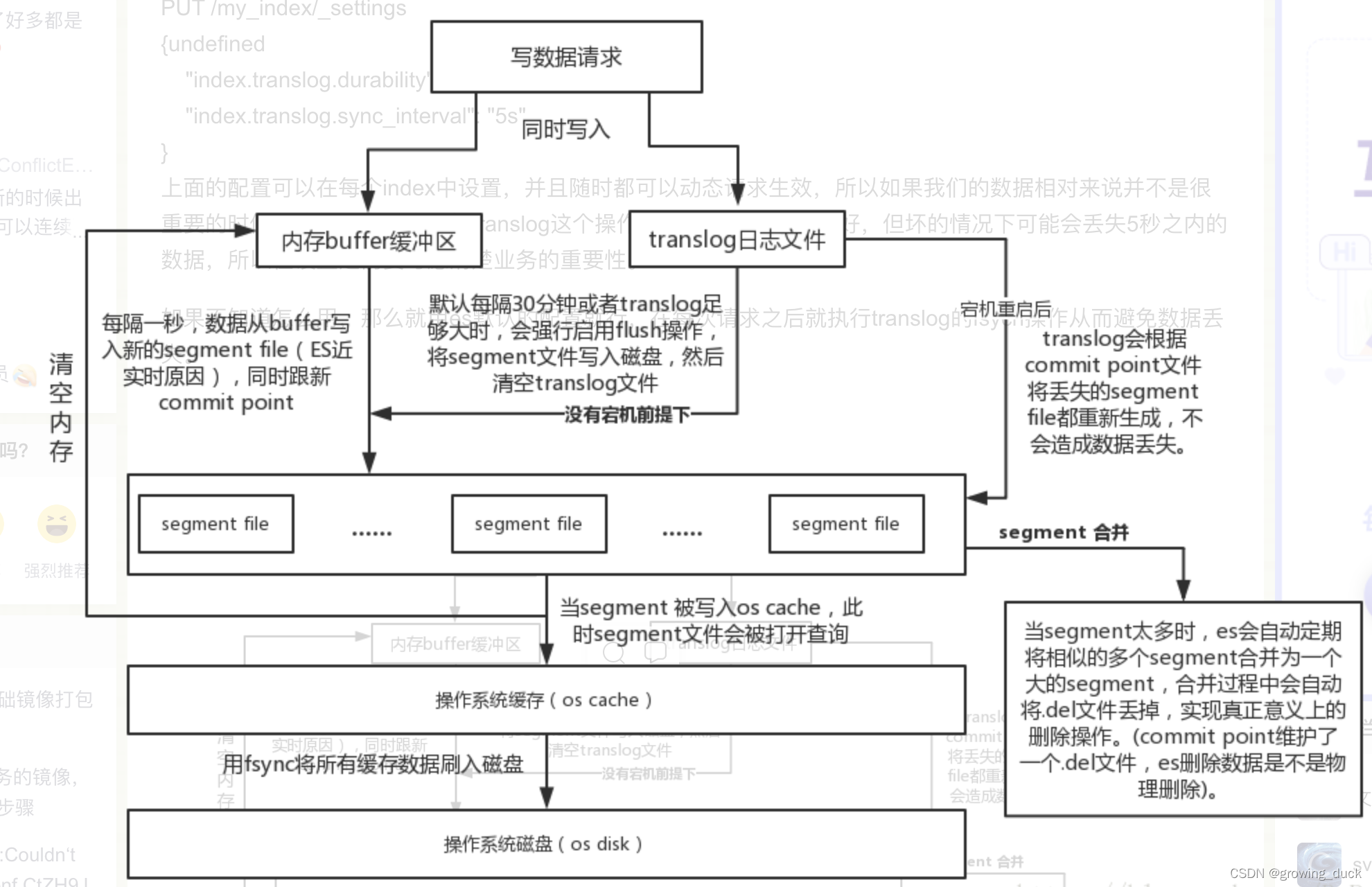 当数据被refresh期间,新的操作日志会继续追加到translog,默认每次写请求(如 index, delete, update, bulk)都会刷盘。?这样会有很大的性能问题,所以如果能容忍5s内的数据丢失情况,还是使用每5s异步刷盘的方式。