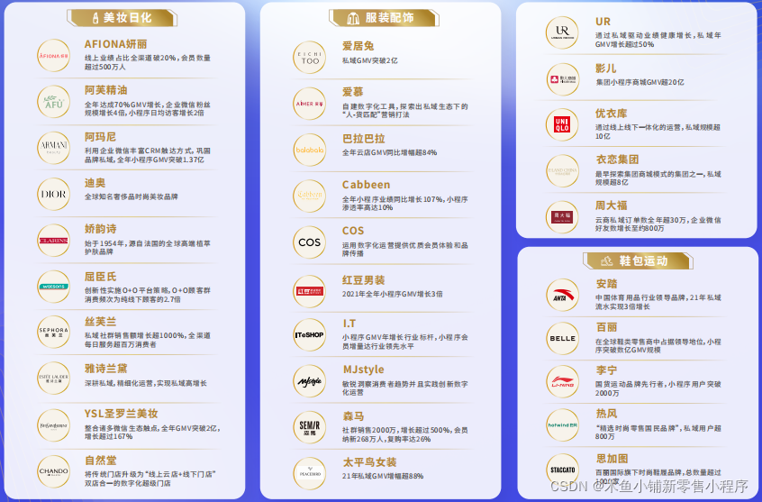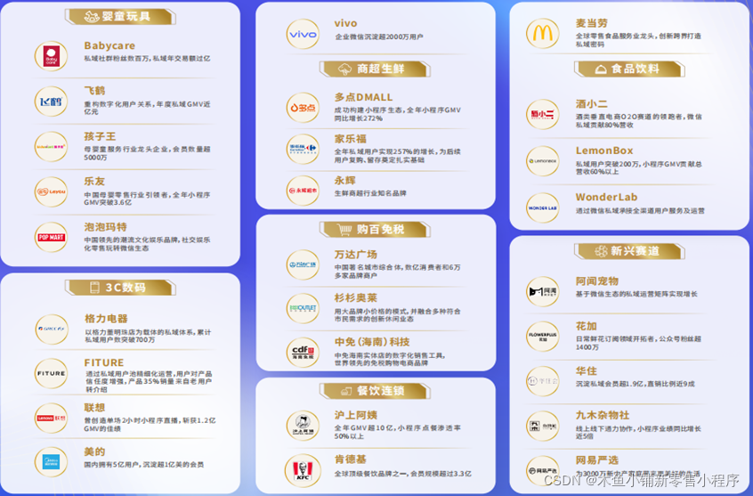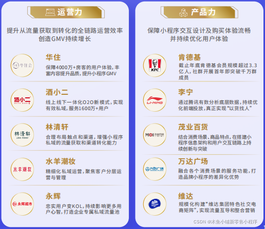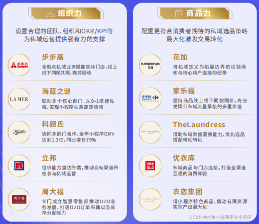 ? 2、小程序成私域必备基建 值得一提的是,除了榜单本身,腾讯智慧零售联手经济观察报还集结了来自产业一线、创投咨询、学术研究、媒体观察等多领域专家,发起了主题为“新空间 新增长 新引擎”的智慧零售创新研讨会,从宏观经济、消费市场以及品牌数字化发展等角度,针对美妆日化、服装、3C、商超生鲜、餐饮等多个垂直行业进行了私域发展研讨,为行业提供前瞻性指引。 腾讯指出私域成为企业数字化的最轻量级入口,而企业想要实现私域,首先要赋能数字化加持,帮助提升企业对用户和消费者的连接、触达效率以及由触达带来的销售转化效率。微信生态里的小程序、公众号、企业微信、视频号等等则成为承接并容纳私域用户的有效工具和载体,其中,布局微信小程序效果非常显著,通过搭配企业微信+社群等生态产品联合运营,搭建小程序矩阵,从商城、本地门店、会员、试用等多维度进行精细化运营,让用户能够精准地找到对应的功能小程序。据腾讯披露,2021年,小程序的日活突破4.5亿,商家自营的实物交易额同比翻倍,零售、餐饮和旅游小程序交易额同比增长超100%。这些数据表明,扎根于微信的私域新业态已成为越来越多的品牌商家寻求转型、增长的重要阵地。 私域用户池、私域“门店”这些私域基础设施的建设,成为每个企业面对数字化转型的必做功课。腾讯智慧零售市场副总裁常越认为,这 2年是中国私域发展的关键基建年,如果企业不做好私域基建,未来大概率会落后于竞争对手,建设私域已经成为关乎企业生存发展的“必答题”。现在这道题,你开始做了吗? 点击查看相关内容推荐 零售业公私域运营指南首次发布,小程序成布局私域关键 https://blog.csdn.net/muyuxiaopu123/article/details/121680832 教科书式营销案例:瑞幸咖啡如何凭借小程序社群运营实现逆风翻盘 https://mp.csdn.net/mp_blog/creation/editor/122989310