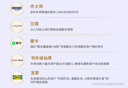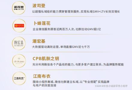 ? “年度飞跃标杆” “年度飞跃标杆”是经过专家评审团进行综合判断,推选出2021年企业入门私域快速增长,且在私域经营取得显著突破的十佳品牌。