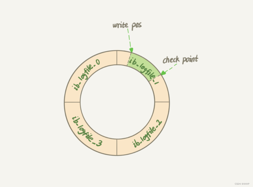 redo log时InnoDB引擎特有的日志。此外,InnoDB的redo log是固定大小的,比如可以配置为4个文件,每个文件1GB。从头开始写,写到末尾就循环开始写。如下图所示,write pos代表写入的位置,从logfile0一直写入到logfile3,再循环,即顺时针方向。check point代表当前要擦除的位置,也是顺时针方向。图中绿色部分是可以写入的位置,黄色部分是已经写入内容的位置。当write pos指针追上check point时就代码log已满。