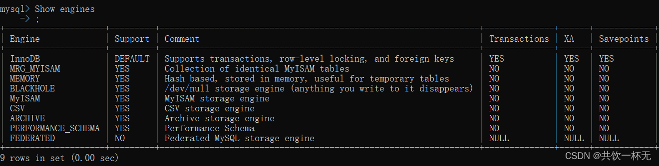 show engines  Mysql 5.7.27版本支持的存储引擎有9个。
