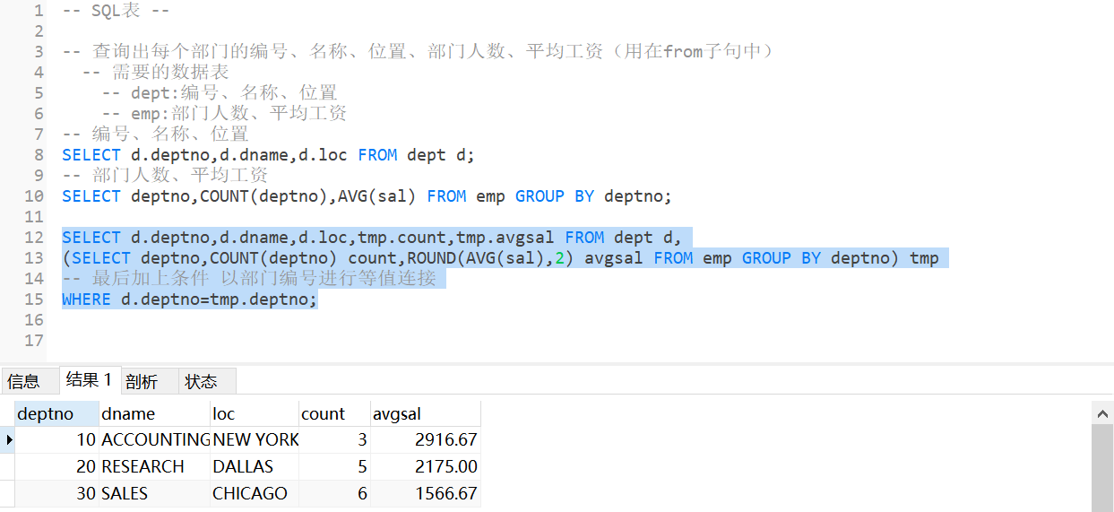 (SELECT deptno,COUNT(*) count,AVG(sal) avgsal FROM emp GROUP BY deptno) d