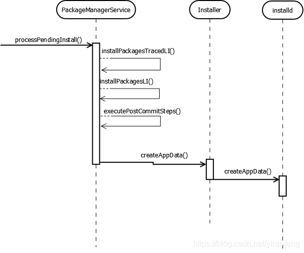 通过一系列的调用,最终会调用到Installer.java的createAppData()方法进行安装,交给installed进程进行APK的安装。