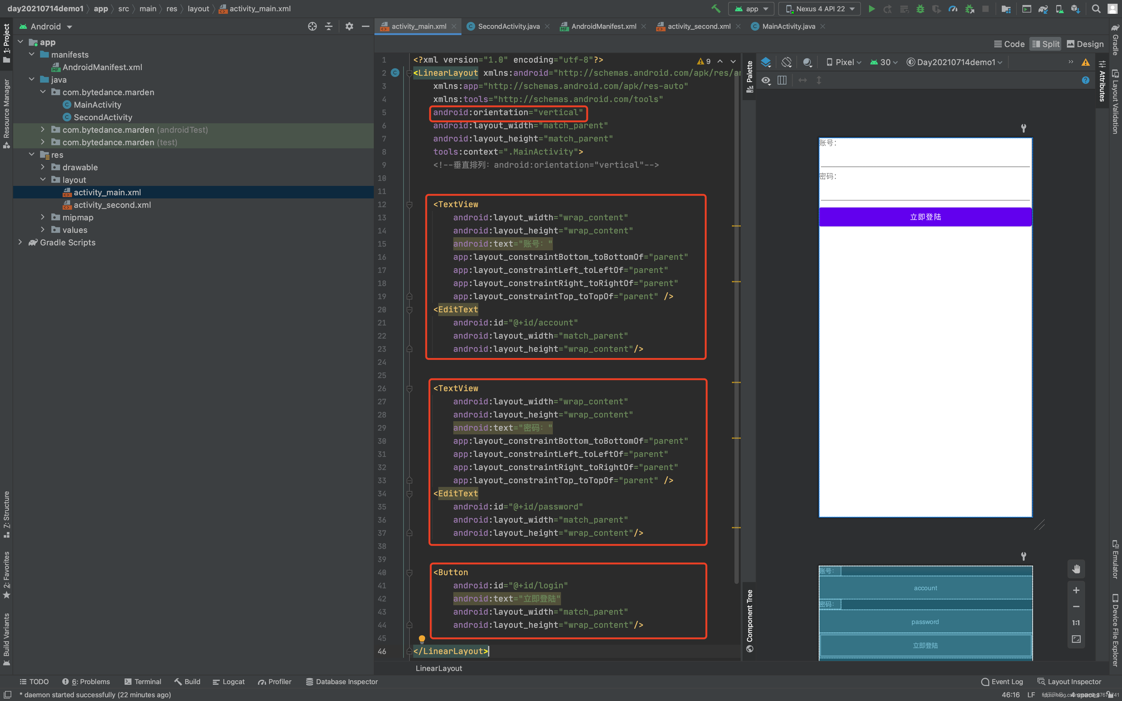 第二步:在第一个Activity的activity_main.xml中,编写登陆页面,包含账号输入、密码输入、登陆按钮。