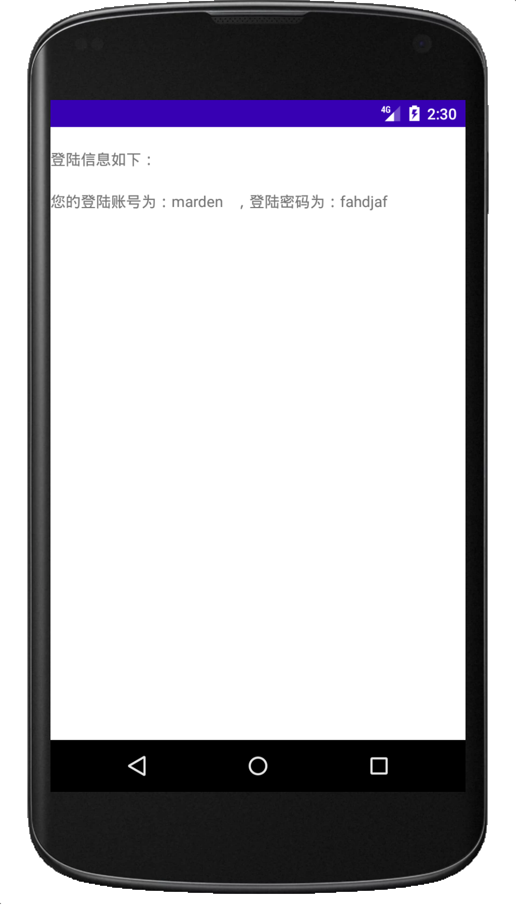 info.setText("您的登陆账号为:"+account+" ,登陆密码为:"+password);