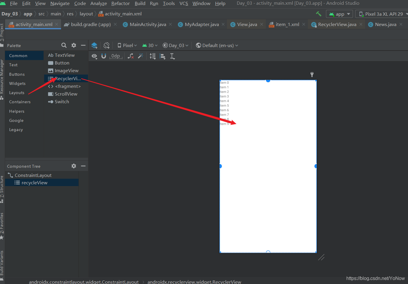 第一种是在xml文件当中引用,当你第一次使用这个RecycleView的时候,Android会自动帮你导包。