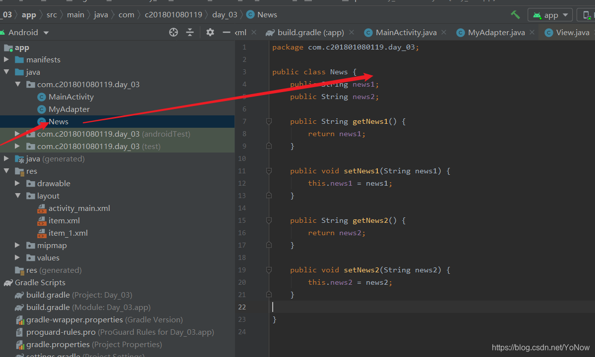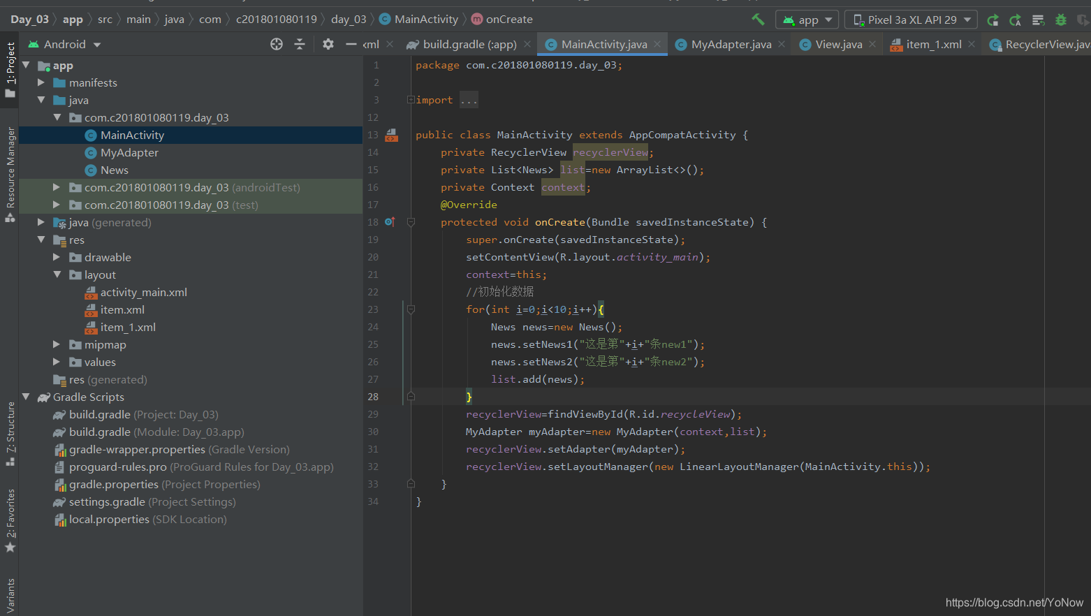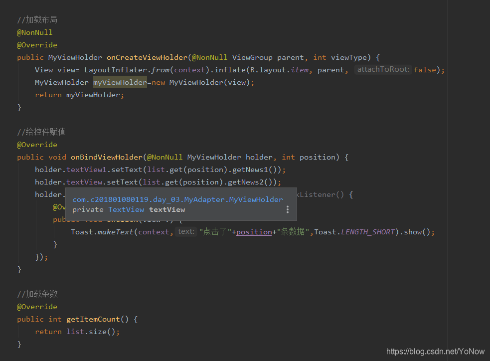 首先我们创建一个MyAdapter的类,并让他继承RecycleView.Adapter,主要去实现以下三个方法,用来加载布局,给控件赋值以及显示数据的条数。