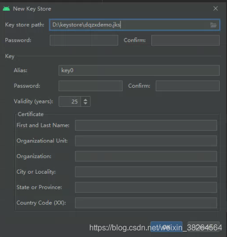 相应的密码和信息随意填即可,别忘了就行,Alias是别名,Validity是有效时长: