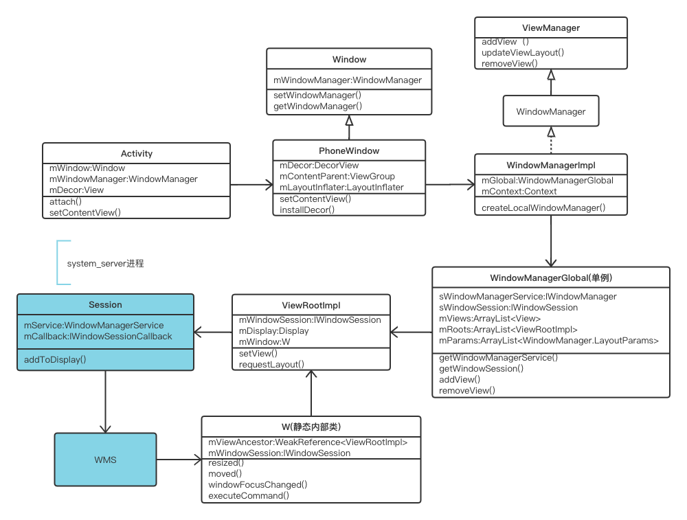 实现WindowManager接口,PhoneWindow创建出WindowManagerImpl,WindowManager接口继承自ViewManager,主要负责通过WindowManagerGlobal实现addView,removeView,updateViewLayout操作。