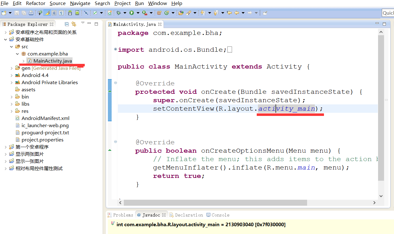 (1)打开MianActivity.java,接着把鼠标放在activity_main中,按住ctrl按键并双击,