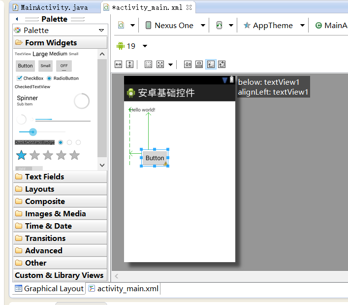 (3)在界面中拖拽一个button按键,此时进入activity_main.xml,自动生成有关button按键的代码。