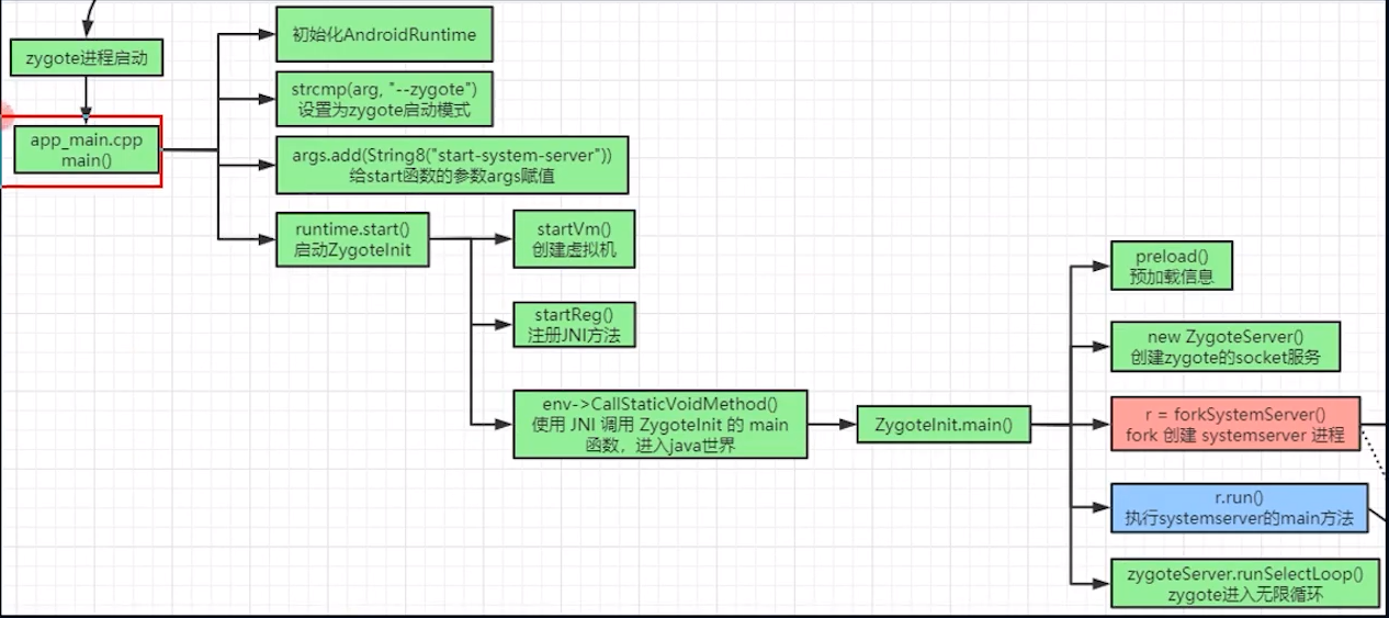 class AppRuntime : public AndroidRuntime 【app_main.cpp】? --> AppRuntime runtime【app_main.cpp】 --> runtime.start("com.android.internal.os.ZygoteInit", args, zygote);? 【启动Android运行时】?【app_main.cpp】 -->