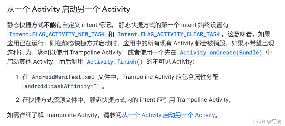 ? ?这里要讲的是静态快捷方式,静态快捷方式在xml下的xxx.xml文件中定义Intent,但是其启动模式(Intent Flag)是由系统自定义的,官方文档这一段话非常重要: