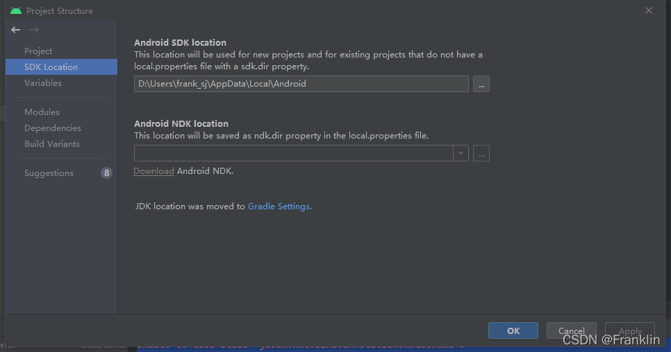 ndk.dir?- NDK 的路径。此属性已被弃用。NDK 的所有下载版本都将安装在 Android SDK 目录下的?ndk?目录中。sdk.dir?- SDK 的路径。cmake.dir?- CMake 的路径。ndk.symlinkdir?- 在 Android Studio 3.5 及更高版本中,创建指向 NDK 的符号链接,该符号链接的路径可比 NDK 安装路径短。