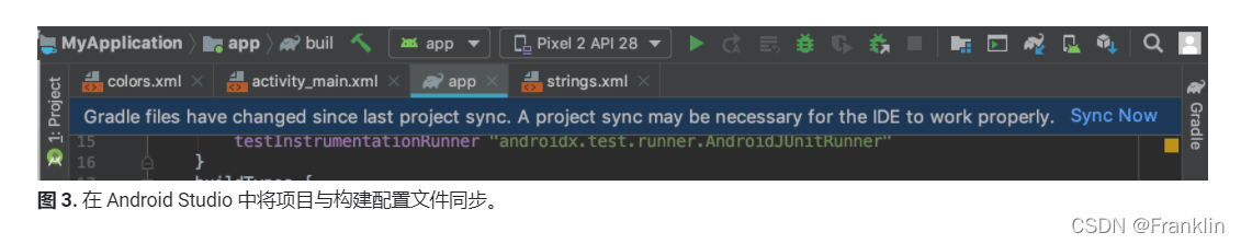 如需同步项目文件,请点击做出更改后显示的通知栏中的?Sync Now(如图 3 所示),或者点击菜单栏中的?Sync Project?图标?