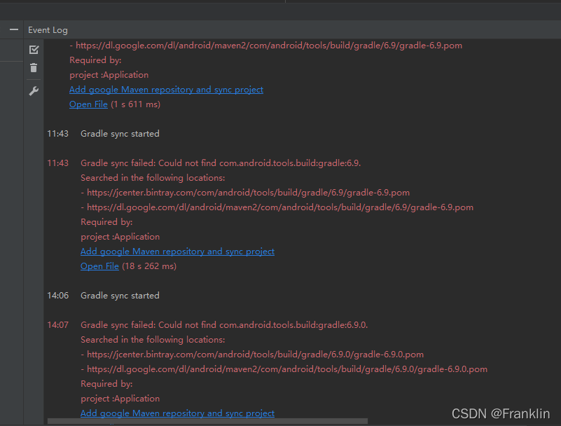 11:43?? ?Gradle sync failed: Could not find com.android.tools.build:gradle:6.9. ?? ??? ??? ?Searched in the following locations: ?? ??? ??? ?- https://jcenter.bintray.com/com/android/tools/build/gradle/6.9/gradle-6.9.pom ?? ??? ??? ?- https://dl.google.com/dl/android/maven2/com/android/tools/build/gradle/6.9/gradle-6.9.pom ?? ??? ??? ?Required by: ?? ??? ??? ?project :Application ?? ??? ??? ?Add google Maven repository and sync project ?? ??? ??? ?Open File (18 s 262 ms)