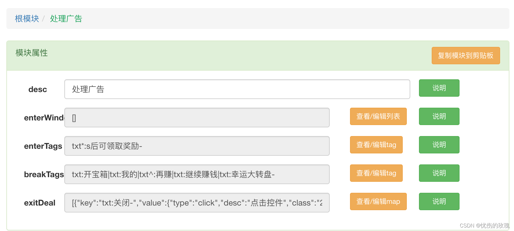 - enterTags,广告窗口中某个标识性控件的tag数组,当出现其中一个tag时,表示进入了广告。