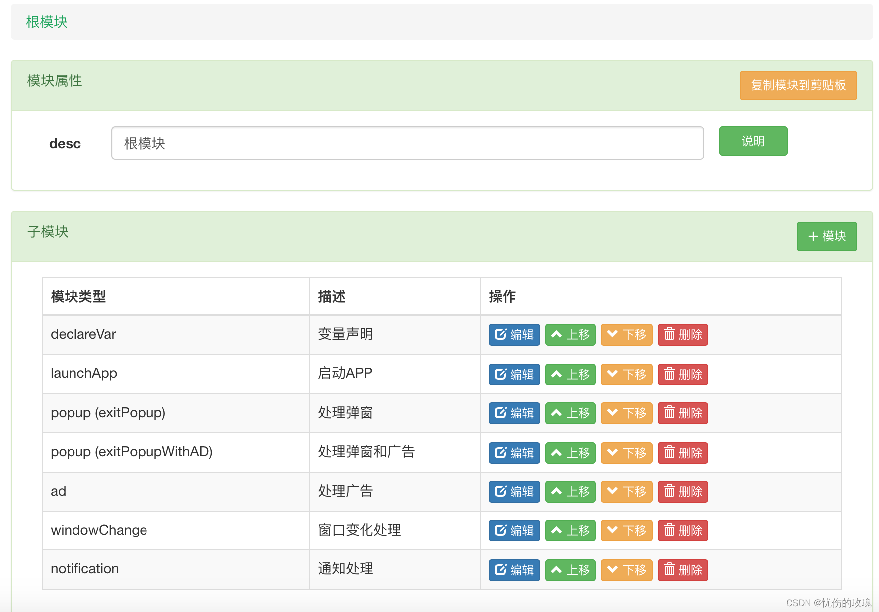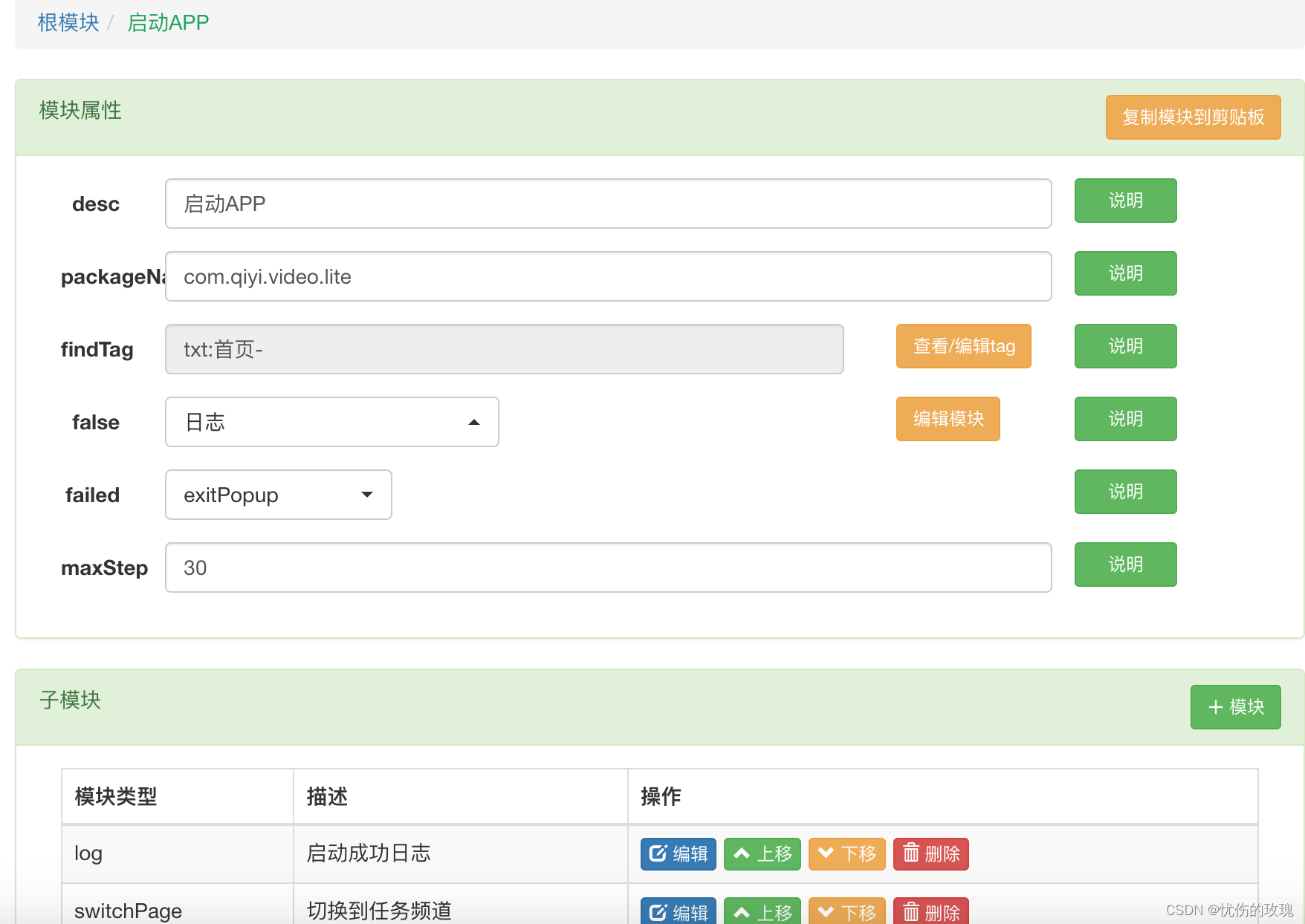 ????????如果打算启动和处理APP,必须添加这个模块。点击该模块的“编辑”按钮,属性和子模块如下图所示: