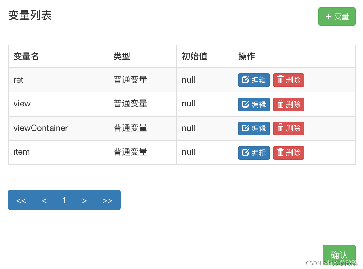 ? ? ? ? 声明一些后面模块要用的通用变量,系统会自动生成几个常用的变量,个人感觉绝大部份情况下系统默认生成的就够用了😄。点击“编辑”按钮,再点击“查看/编辑变量声明”,显示如下变量: