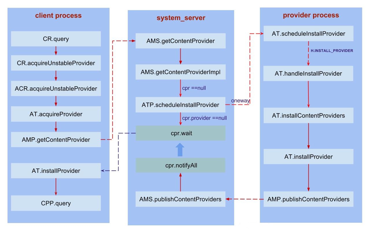 场景二(Provider进程已启动但未发布): provider进程已存在且attach到system_server,但所对应的provider还没有发布,通过binder call到provider进程执行AT.scheduleInstallProvider方法。