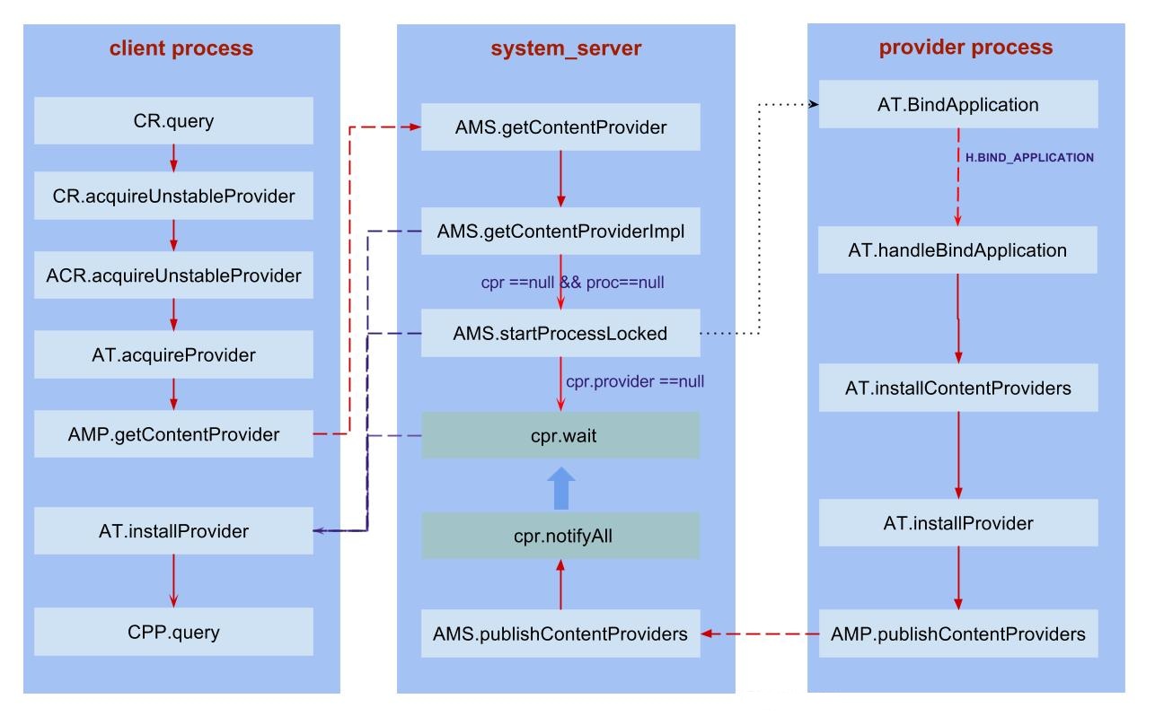 场景一(Provider进程尚未启动):system_server进程调用startProcessLocked()创建provider进程且attach到system_server后,通过binder call到provider进程执行AT.bindApplication()方法 。