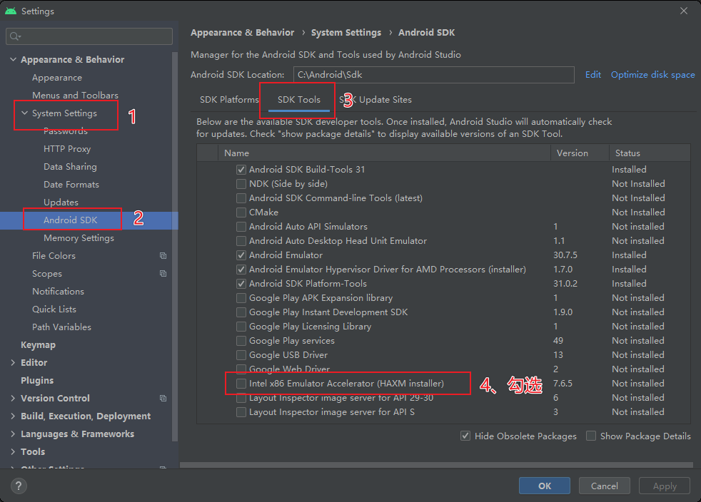 - 安装HAXM插件(自带模拟器,不推荐使用,因为我本地运行项目未成功运行,😂😂😂)