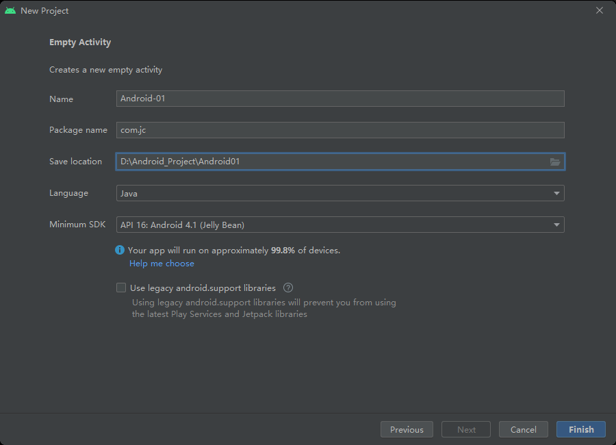 - 设置项目相关信息(项目名,包名,项目路径,开发语言等)→【Finish】