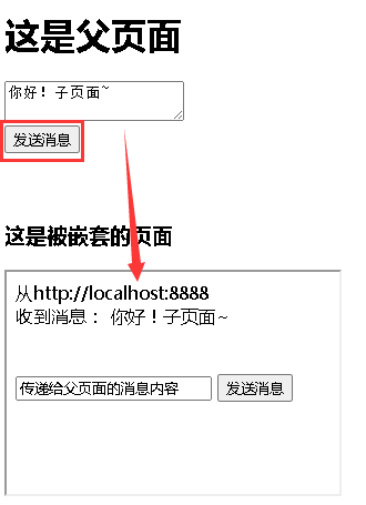 document.querySelector("#receiver").contentWindow.postMessage(input.value, "http://localhost:8888");//传信息给iframe页面