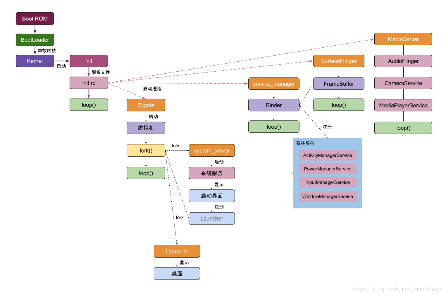 启动桌面Launcher App,首先会通过Zygote进程fork一个新进程作为App进程,然后创建Application ,创建启动Activity,最后用户才会看到桌面。