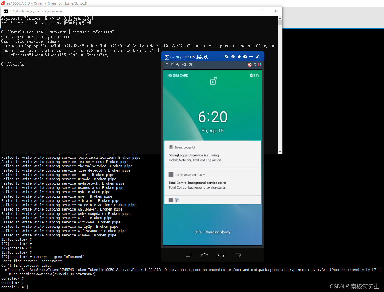 C:\Users\s> C:\Users\s>adb shell dumpsys | findstr "mFocused" Can't find service: gsiservice Can't find service: idmap ? mFocusedApp=AppWindowToken{bed0eea token=Token{c956d5 ActivityRecord{4896f8c u0 com.debug.loggerui/.MainActivity t8}}} ? ? mFocusedWindow=Window{19c2bab u0 com.debug.loggerui/com.debug.loggerui.MainActivity} ? ? mFocusedApp=Token{c956d5 ActivityRecord{4896f8c u0 com.debug.loggerui/.MainActivity t8}}