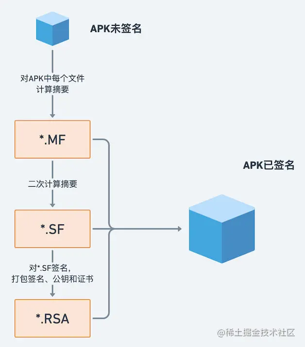 v1签名方式主要是利用META-INFO文件夹中以MF、SF 和 RSA 的三个文件,流程如下所示: