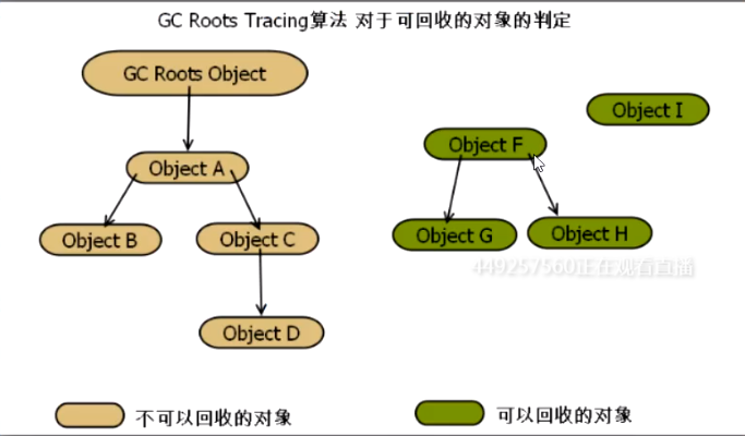 ???????通过一系列称为"GC Roots"的对象作为起始点,从这些点向下搜索,搜索所有的引用链,当一个对象到GC Roots没有任何引用链(即GC Roots到对象不可达)时,则证明该对象是不可用的。 ???????判定图如下: