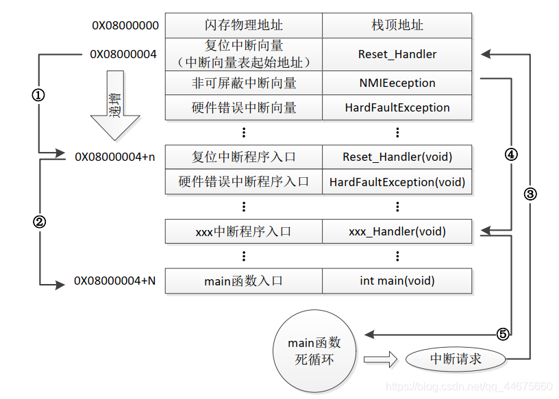 左图是正常执行代码的过程,右图是具有IAP功能的代码执行过程,STM32F4 复位后,还是从 0X08000004 地址取出复位中断向量的地址,并跳转到复位中断服务程序,在运行完复位中断服务程序之后跳转到 IAP 的 main 函数,然后根据情况跳转到app的main函数中;在 main 函数执行过程中,如果 CPU 得到一个中断请求, PC 指针仍强制跳转到地址0X08000004 中断向量表处,而不是新程序的中断向量表,但是如果是复位的话,就会跳出app程序重新开始执行IAP程序。