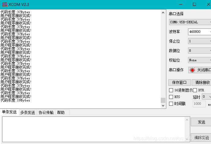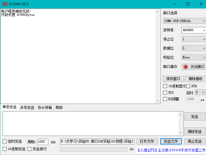 ?如下图,在正点原子的例程中的delay_ms(10);这个延时函数最好加上,因为他这个例程判断是否接收完成是看USART_RX_CNT=oldcount,即接收到到字节数是否发生变化来判断的,单片机程序执行的速度快于串口助手发送数据的速度,如果不加延时就会出现短暂的USART_RX_CNT=oldcount的误判,然后让USART_RX_CNT和oldcount清零,造成如图3所示,串口一直发送代码长度的情况出现,而且会影响后面 iap_write_appbin(FLASH_APP1_ADDR,USART_RX_BUF,applenth );的执行,造成无法写入flash,如果把橙色那句代码改成iap_write_appbin(FLASH_APP1_ADDR,USART_RX_BUF,sizeof(USART_RX_BUF));这样就可以不用管延时了。