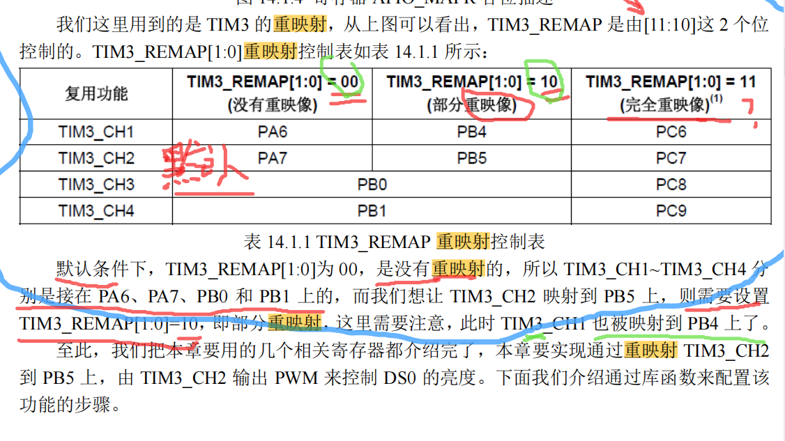 下面代码中使用的为TIM3_CH2,TIM3_CH3,重映射对应的引脚为PB5,PB0