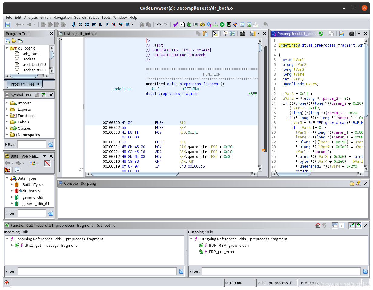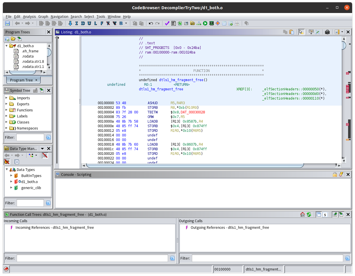 但是让我奇怪的是,当我导入一个二进制文件的时候(例如这里讲的d1_both.o文件),需要自己选择语言,并且在其Console中会报一系列error,类似于:
