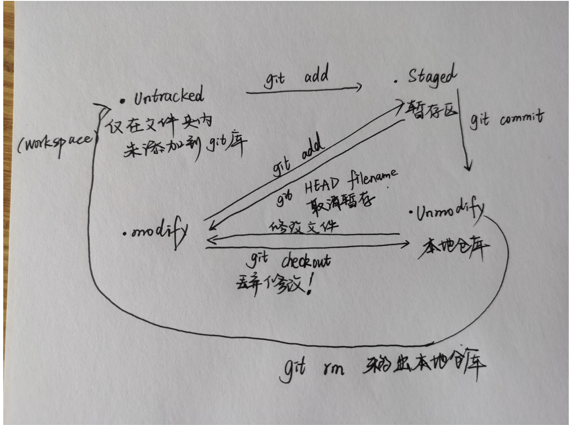 - Staged:暂存,使用git commit命令可以将文件同步上传到本地仓库之中,文件为Unmodify状态,执行git HEAD filename取消暂存,文件状态变为Modified